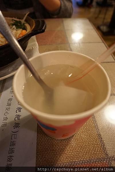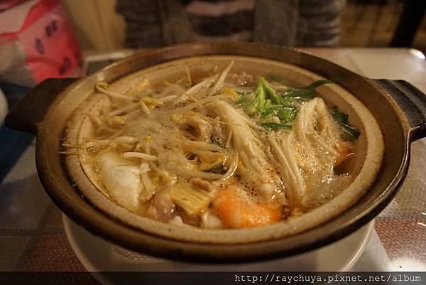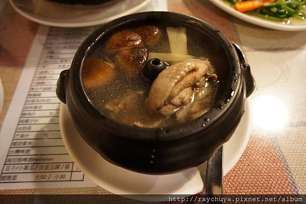 湯頭味道比較重,香菇跟雞肉的份量盛滿了這一個小鍋子,但喝起來其實普通,雞肉的鮮味沒出來,